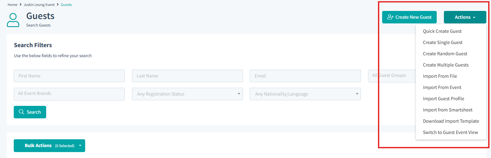 Click the 'Action' button from the Guests index page and select "Create Multiple Guests"