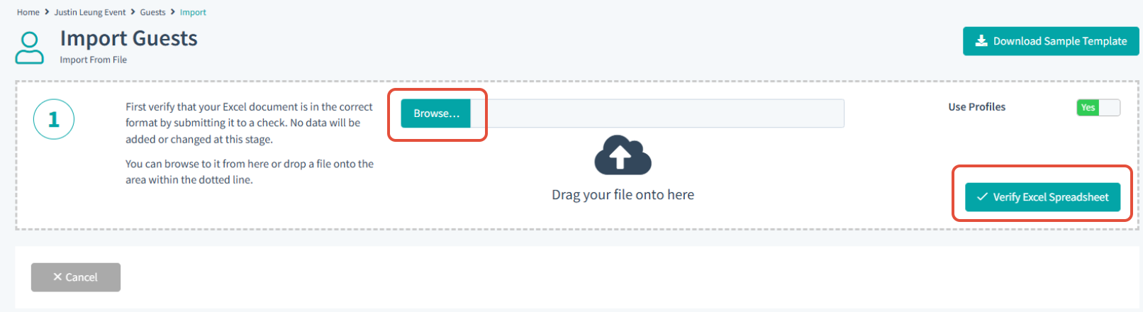 Once the Guest Import template has been completed and saved, select 'Import from file' which will take you to the page below. Select 'Browse', choose the import template and follow the 'verify excel spreadsheet' steps.