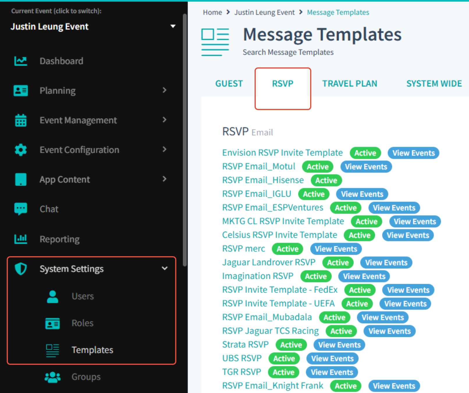Start by clicking on 'System settings' and then click on 'Templates'. Select the RSVP tab.