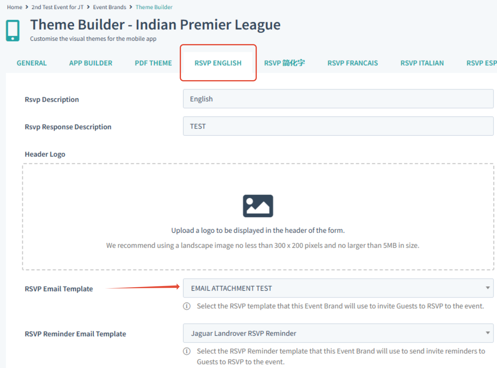 Select the RSVP English Tab then for the Field RSVP Email Template choose the RSVP you newly created.