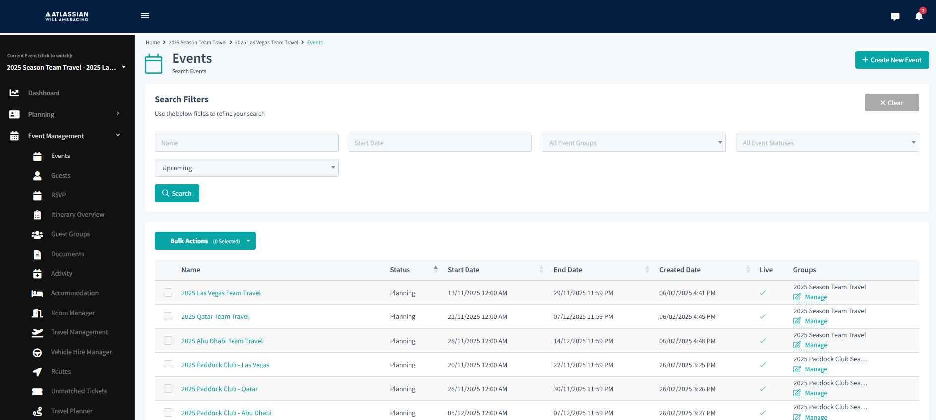 Start by clicking on Event Management on the left side menu and select Events. Here you will see any existing events that have been created with the option to create a new event in the top right corner.