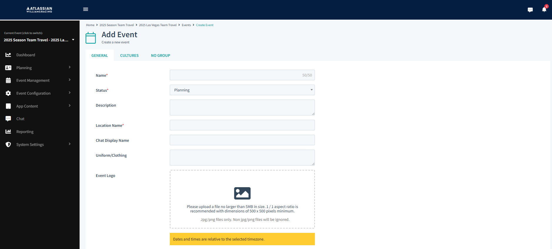 - Here you start to create the event by inputting event information such as Name, Location, Time Zones, and if any existing event brands and groups can be added for convenience