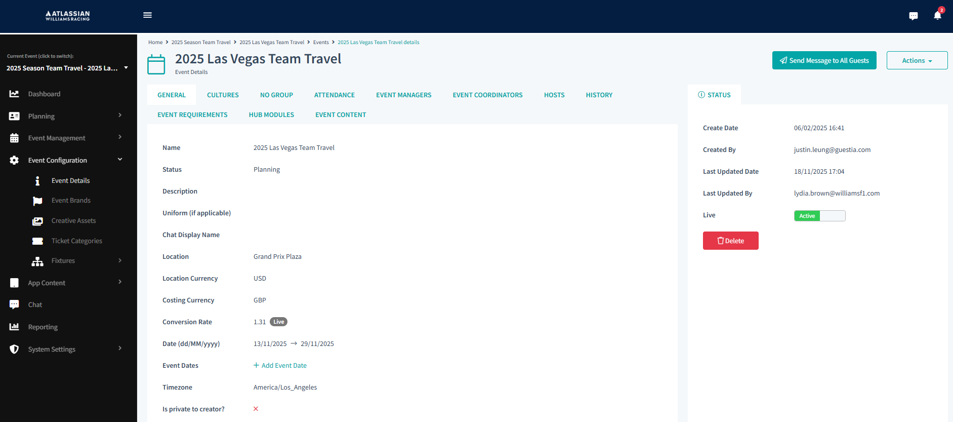 On the event details page, you will find all the General information of the event, the status of the event on the left side, and the History which shows any changes, the creation date and the users involved when making changes