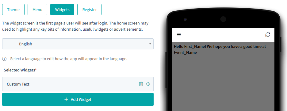 Event Configuration > Event Brands > Actions (On desired brand) > Change Theme > App Builder > Widgets